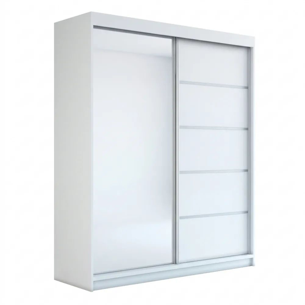 Der Kleiderschrank verfügt über Schwebetüren und sechs Einlegeböden, komplettiert durch eine Kleiderstange. Die Schwebetüren laufen auf stabilen Schienen. Die Aluminiumgriffe unterstützen die einfache Bedienung. Zwei große Spiegelflächen sorgen für eine optische Vergrößerung des Raums. Die laminierten Oberflächen sind abrieb- und feuchtigkeitsbeständig, was eine leichte Reinigung ermöglicht.